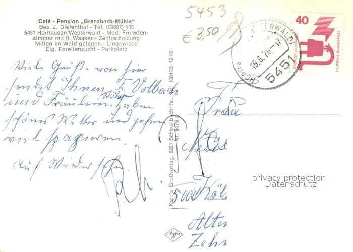 Horhausen_Westerwald Hirschbruft Cafe Pension Grenzbachmuehle Muehle Garten Cafe Terrasse Speiseraum Horhausen_Westerwald postalisch gelaufen 1976 Erhaltung siehe scans [WerneD78] WernPID7