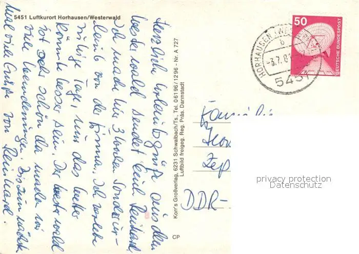 Horhausen_Westerwald Luftkurort Fliegeraufnahme Horhausen_Westerwald postalisch gelaufen 1981 Erhaltung siehe scans [FriedD77] Frierer
