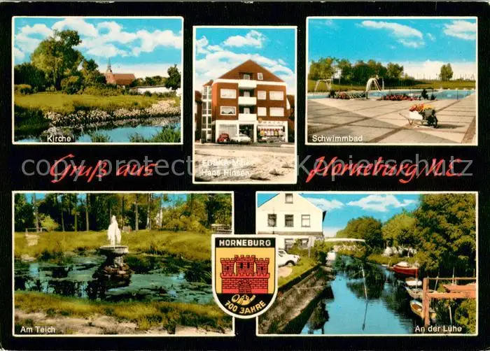 Horneburg Niederelbe Kategorie Alte Ansichtskarten Postkarten bx93957 Horneburg_Niederelbe Kirche Edeka Markt Schwimmbad Am Teich An der Luhe Horneburg Niederelbe postalisch gelaufen 1984 Erhaltung siehe scans [WerneD78]