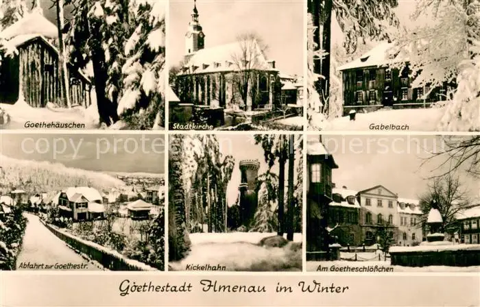 AK / Ansichtskarte Ilmenau_Thueringen Goethehaeuschen Stadtkirche Gabelbach Abfahrt Kickelhahn Am Goetheschloesschen Ilmenau Thueringen