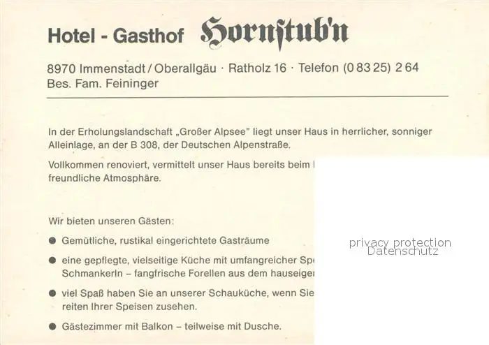 Immenstadt_Allgaeu Hotel Gasthof Hornstubn Immenstadt_Allgaeu postalisch nicht gelaufen nach 1965 Werbekarte (keine Postkarte) Erhaltung siehe scans [WerneD78] Werbekarte (keine Postkarte) WernPID7