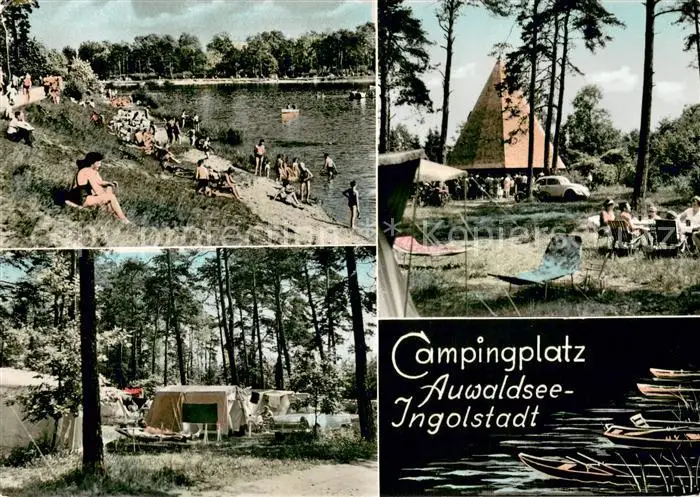 AK / Ansichtskarte Ingolstadt_Donau Campingplatz Auwaldsee Kirche Seepartie Ingolstadt_Donau