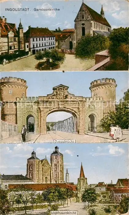 Ingolstadt_Donau Garnisonkirche - Donaubruecke - Liebfrauenkirche Ingolstadt_Donau postalisch gelaufen 1915 Erhaltung siehe scans [LiesaD40] LiesID40