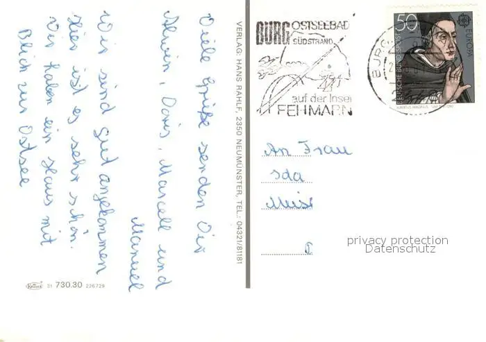 Insel_Fehmarn Ostseeinsel Landkarte Vogelfluglinie Kompass Insel Fehmarn postalisch gelaufen 1981 Erhaltung siehe scans [FriedD77] Frierer