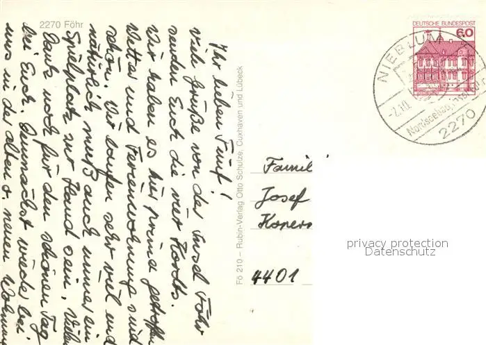 Insel_Foehr Friesenhaus Glockenturm Windmuehle Trachten Strand Pastorat Faehre Wappen Insel_Foehr postalisch gelaufen 1984 Erhaltung siehe scans [FriedD77] Frierer
