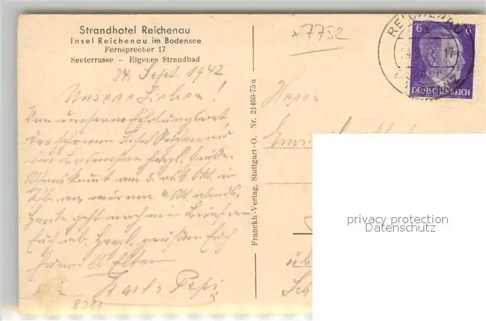 Insel_Reichenau Strandhotel Bootssteg Insel Reichenau postalisch gelaufen 1942 Erhaltung siehe scans [FriedD77] Frierer