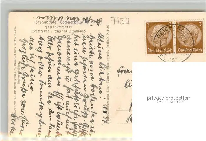 Insel_Reichenau_Bodensee Fliegeraufnahme mit Strandhotel Loechnerhaus postalisch gelaufen 1937 Erhaltung siehe scans [FriedD77] Frierer