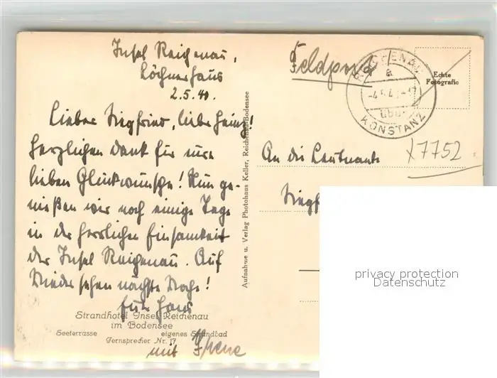 Insel_Reichenau_Bodensee Strandhotel postalisch gelaufen 1940 Feldpost Erhaltung siehe scans [FriedD77] Feldpost Frierer