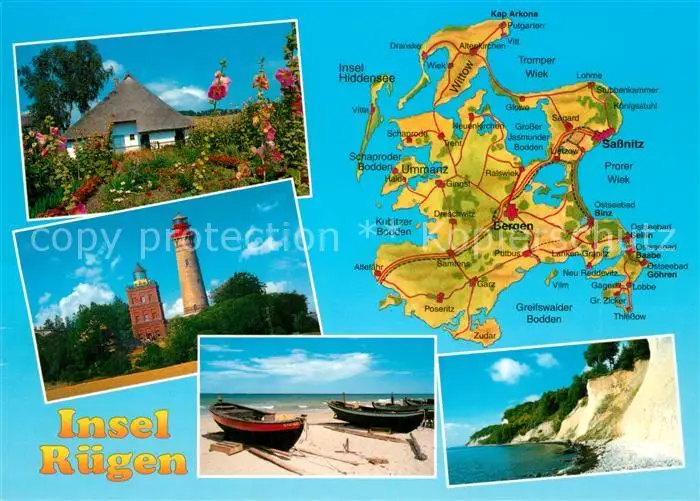 AK / Ansichtskarte Insel_Ruegen Reetdachhaus Leuchtturm Steilkueste Fischerboote Landkarte Insel Ruegen
