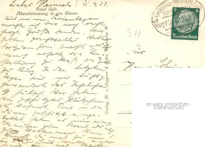 Insel_Sylt Abendstimmung in den Duenen Insel_Sylt postalisch gelaufen 1933 Bahnpost Erhaltung siehe scans [FriedD77] Bahnpost Frierer