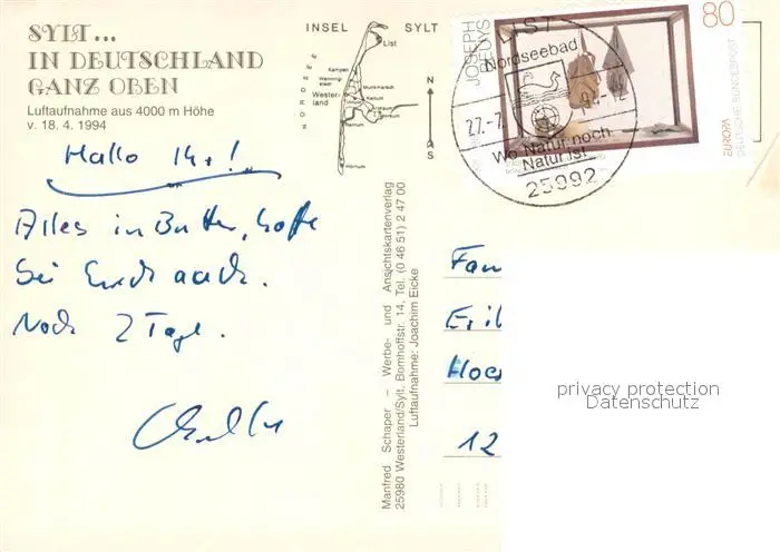 Insel_Sylt Fliegeraufnahme aus 4000 m Hoehe Insel_Sylt postalisch gelaufen 1994 Erhaltung siehe scans [FriedD77] Frierer