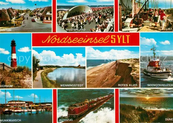AK / Ansichtskarte Insel_Sylt Ortschaften auf der Nordseeinsel Konzertpavillon Leuchtturm Hafen Rotes Kliff Seenotkreuzer Autozug Hindenburgdamm Duene Insel_Sylt
