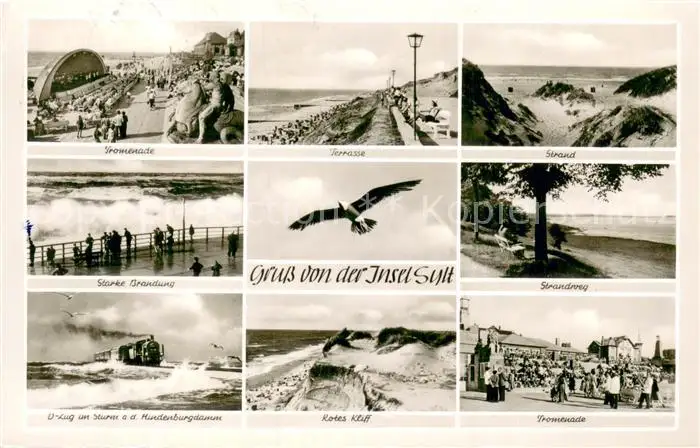 AK / Ansichtskarte Insel_Sylt Promenade Brandung D_Zug im Sturm auf dem Hindenburgdamm Terrasse Strand Rotes Kliff Strandweg Insel_Sylt