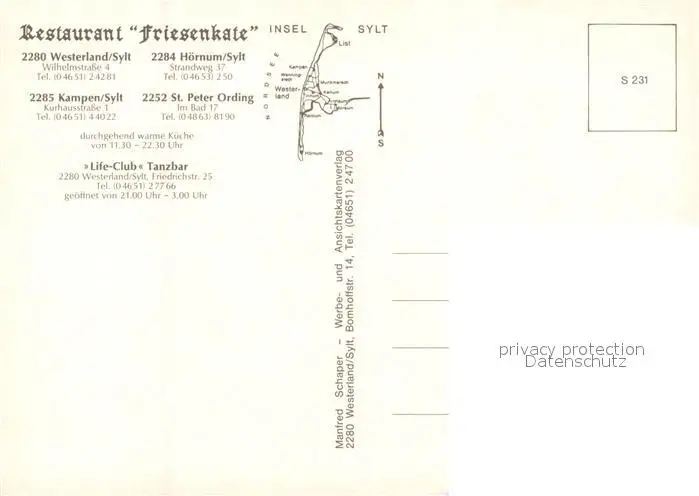 Insel_Sylt Kategorie Alte Ansichtskarten Postkarten bx45644 Insel_Sylt Restaurant Friesenkate in Kampen Hoernum Westerland St. Peter Ording Insel_Sylt postalisch nicht gelaufen nach 1965 Erhaltung siehe scans [LiesaD40]
