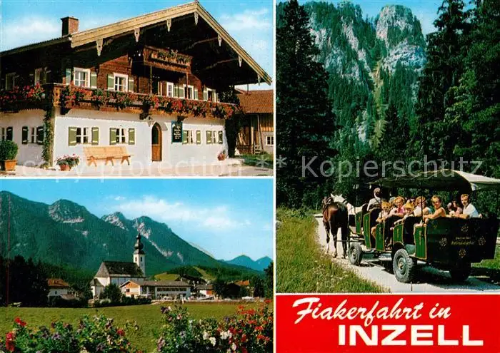 AK / Ansichtskarte Inzell Fiakerfahrt Naturschutzgebiet Blumenschmuck Ortsmotiv mit Kirche Alpen Inzell