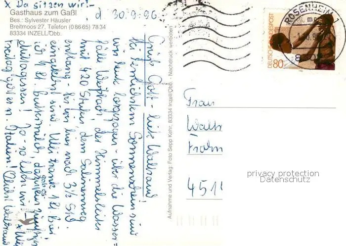 Inzell Gasthaus Zum Gassl Obstbranntwein Wappen Inzell postalisch gelaufen 1996 Erhaltung siehe scans [FriedD77] Frierer