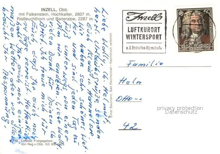 Inzell mit Falkenstein Hochkalter Ristfeuchthorn Reiteralpe Chiemgauer Alpen Inzell postalisch gelaufen 1985 Fliegeraufnahme Erhaltung siehe scans [FriedD77] Fliegeraufnahme Frierer