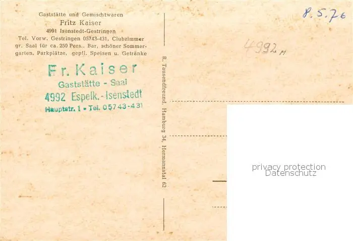 Isenstedt_Luebbecke_Westfalen Gaststaette Fritz Kaiser Gastraeume Bar Isenstedt_Luebbecke postalisch nicht gelaufen 1976 Erhaltung siehe scans [FriedD77] Frierer
