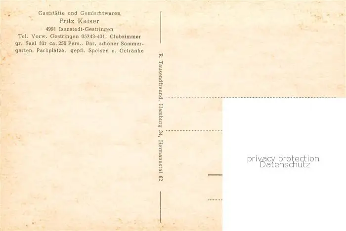 Isenstedt_Luebbecke_Westfalen Gaststaette Fritz Kaiser Gastraeume Bar Isenstedt_Luebbecke postalisch nicht gelaufen 1921-1965 Erhaltung siehe scans [FriedD77] Frierer