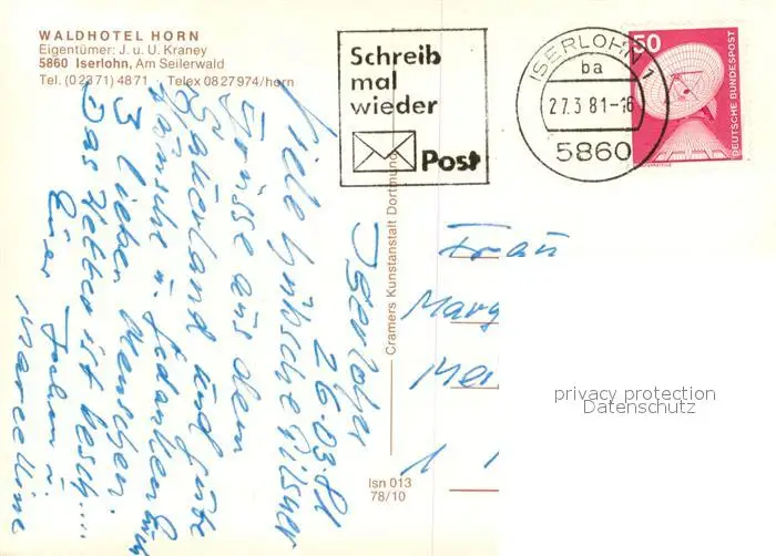 Iserlohn Waldhotel Horn Restaurant Iserlohn postalisch gelaufen 1981 Erhaltung siehe scans [FriedD77] Frierer