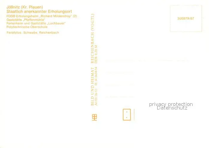 Joessnitz FDGB Erholungsheim Gaststaette Pfaffenmuehle Ferienheim Polytechnische Oberschule Joessnitz postalisch nicht gelaufen 1987 Erhaltung siehe scans [FriedD77] Frierer