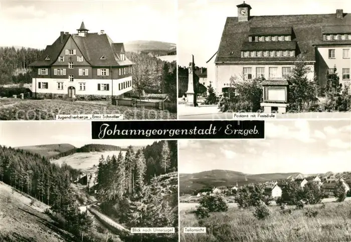 AK / Ansichtskarte Johanngeorgenstadt Jugendherberge Ernst Schneller Postamt mit Postsaeule Landschaftspanorama Unterjugel Johanngeorgenstadt