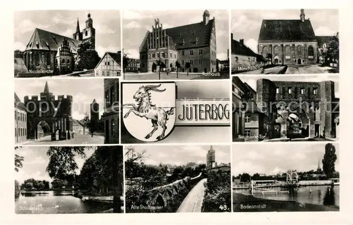 AK / Ansichtskarte Jueterbog Kirche Rathaus Dammtor Schlossteich Stadtmauer Neumarkttor Badeanstalt Freibad Wappen Feldpost Jueterbog