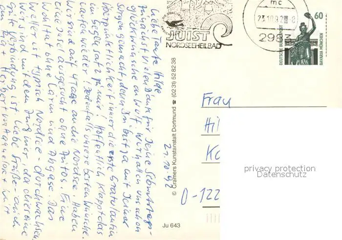 Juist_Nordseebad Janusplatz Strandstrasse Wasserturm Strand Domaene Bill Kurpark Juist_Nordseebad postalisch gelaufen 1992 Erhaltung siehe scans [FriedD77] Frierer