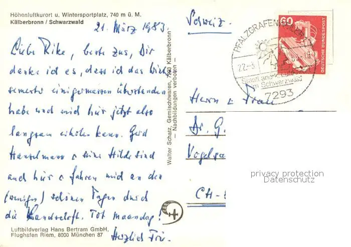 Kaelberbronn Hoehenluftkurort Wintersportplatz im Schwarzwald Fliegeraufnahme Kaelberbronn postalisch gelaufen 1983 Erhaltung siehe scans [FriedD77] Frierer