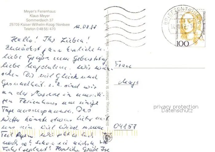 Kaiser-Wilhelm-Koog Meyer's Ferienhaus Kaiser-Wilhelm-Koog postalisch gelaufen 1997 Erhaltung siehe scans [FriedD77] Frierer