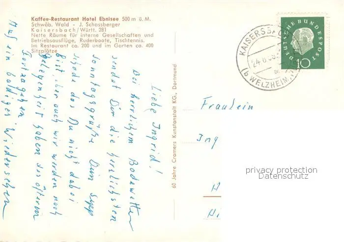 Kaisersbach_Welzheim Kaffee Restaurant Hotel Ebnisee Kaisersbach Welzheim postalisch gelaufen 1965 Erhaltung siehe scans [WerneD78] WernPID7