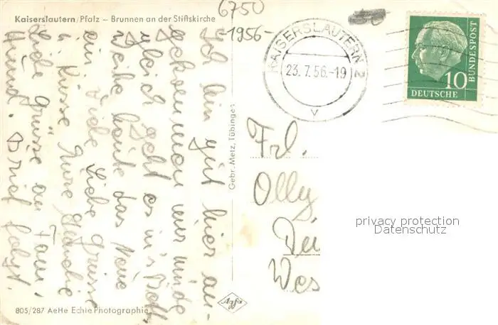 Kaiserslautern Brunnen an der Stiftskirche Kaiserslautern postalisch gelaufen 1956 Erhaltung siehe scans [FriedD77] Frierer