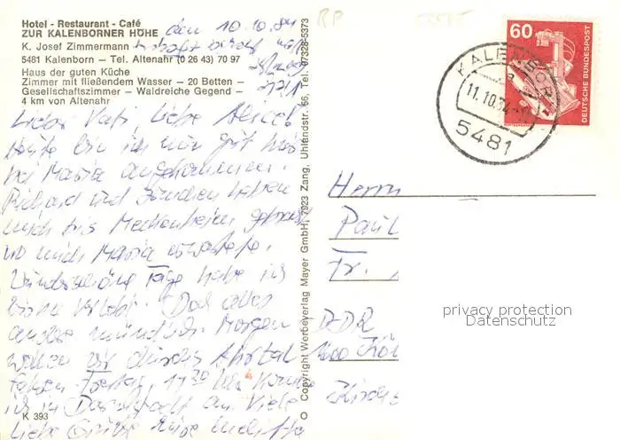 Kalenborn_Ahrweiler Hotel Restaurant Cafe Zur Kalenborner Hoehe Gaststube Theke Kalenborn_Ahrweiler postalisch gelaufen 1984 Erhaltung siehe scans [WerneD78] WernPID7