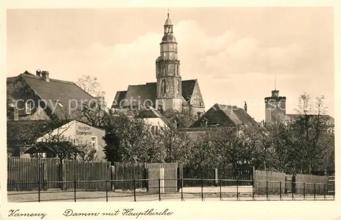AK / Ansichtskarte Kamenz_Sachsen Damm mit Hauptkirche Kamenz Sachsen