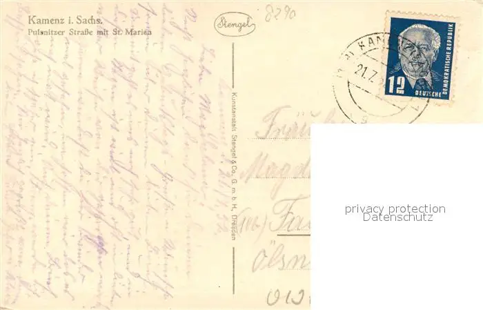 Kamenz_Sachsen Pulsnitzer Strasse mit St Marien Kamenz Sachsen postalisch gelaufen 1952 Erhaltung siehe scans [WerneD78] WernPID7