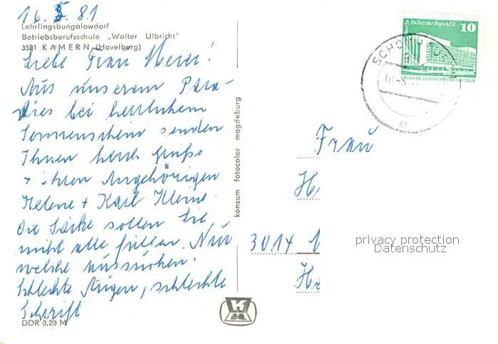 Kamern Bungalowdorf der Lehrlinge Betriebsberufsschule Walter Ulbricht Kamern postalisch gelaufen 1981 Erhaltung siehe scans [FriedD77] Frierer