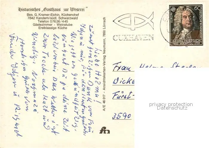 Kandern Historisches Gasthaus zur Weserei Kandern postalisch gelaufen 1986 Erhaltung siehe scans [FriedD77] Frierer
