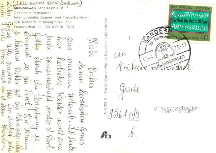 Kandern Missionswerk Janz Team Haus Palmgarten Jugend- und Freizeitzentrum Kandern postalisch gelaufen 1976 Erhaltung siehe scans [FriedD77] Frierer
