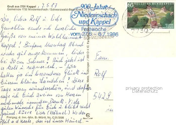 Kappel_Niedereschach Fliegeraufnahme Kappel Niedereschach postalisch gelaufen 1987 Erhaltung siehe scans [WerneD78] WernPID7