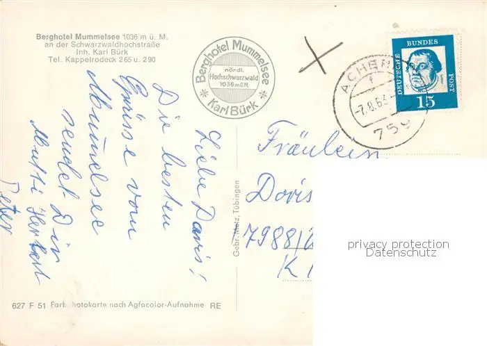 Kappelrodeck Berghotel Mummelsee Kappelrodeck postalisch gelaufen 1963 Erhaltung siehe scans [FriedD77] Frierer