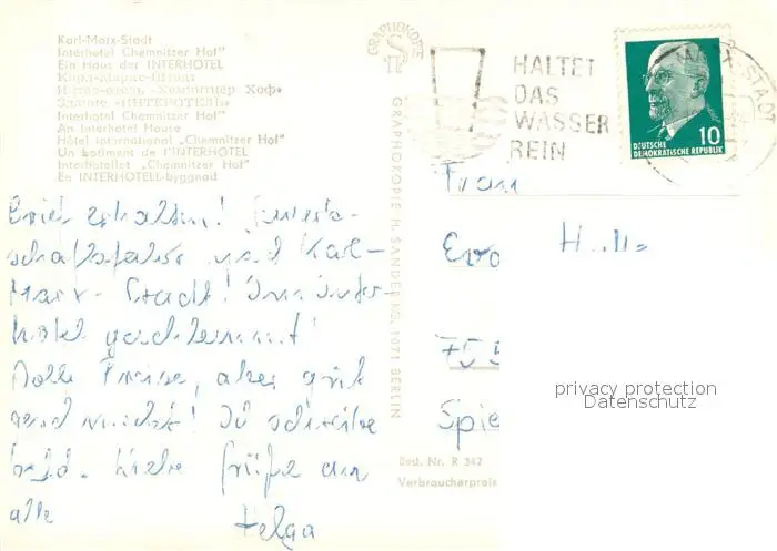 Karl-Marx-Stadt Interhotel Chemnitzer Hof Karl-Marx-Stadt postalisch gelaufen nach 1965 Erhaltung siehe scans [FriedD77] Frierer