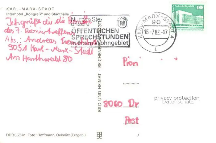 Karl-Marx-Stadt Interhotel Kongress und Stadthalle Nachtaufnahme Karl-Marx-Stadt postalisch gelaufen 1982 Erhaltung siehe scans [FriedD77] Frierer