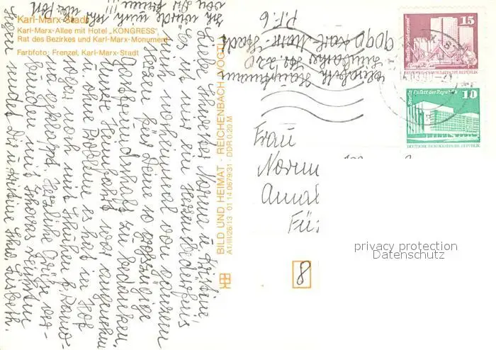 Karl-Marx-Stadt Karl Marx Allee mit Hotel Kongress Rat des Bezirkes Karl Marx Monument Denkmal Karl-Marx-Stadt postalisch gelaufen 1990 Erhaltung siehe scans [FriedD77] Frierer