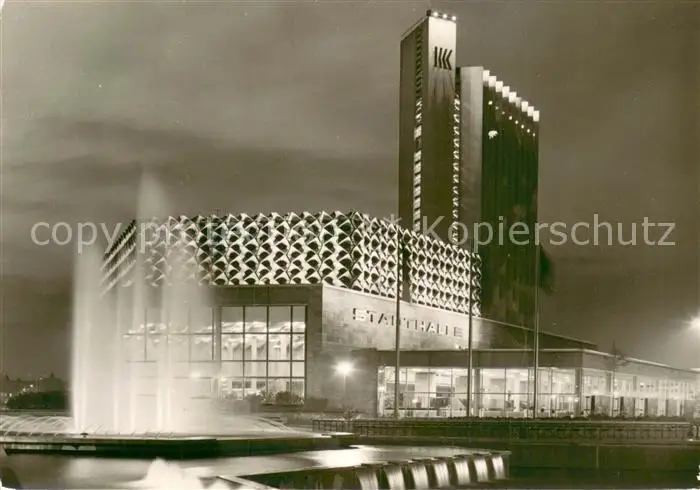 AK / Ansichtskarte Karl Marx Stadt Stadthalle mit Interhotel Kongress Springbrunnen Nachtaufnahme Karl Marx Stadt