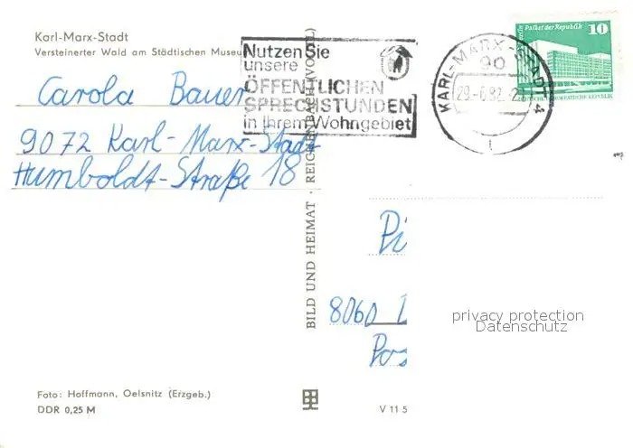 Karl-Marx-Stadt Versteinerter Wald am Staedtischen Museum Karl-Marx-Stadt postalisch gelaufen 1982 Erhaltung siehe scans [FriedD77] Frierer
