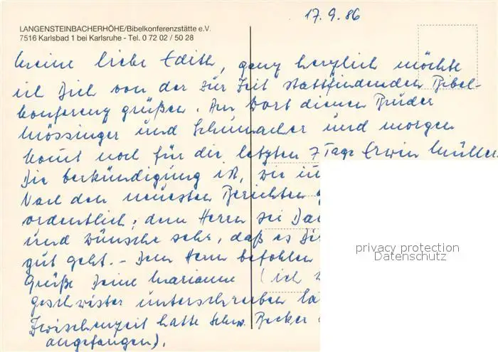 Karlsbad_Karlsruhe Langensteinbacherhoehe Bibelkonferenzstaette Karlsbad_Karlsruhe postalisch nicht gelaufen 1986 Erhaltung siehe scans [WerneD78] WernPID7