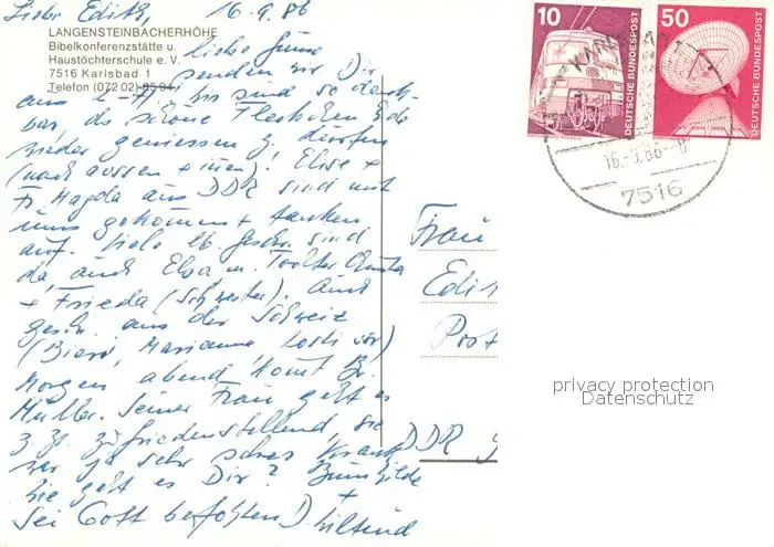 Karlsbad_Karlsruhe Langensteinbacherhoehe Bibelkonferenzstaette Karlsbad_Karlsruhe postalisch gelaufen 1986 Erhaltung siehe scans [WerneD78] WernPID7