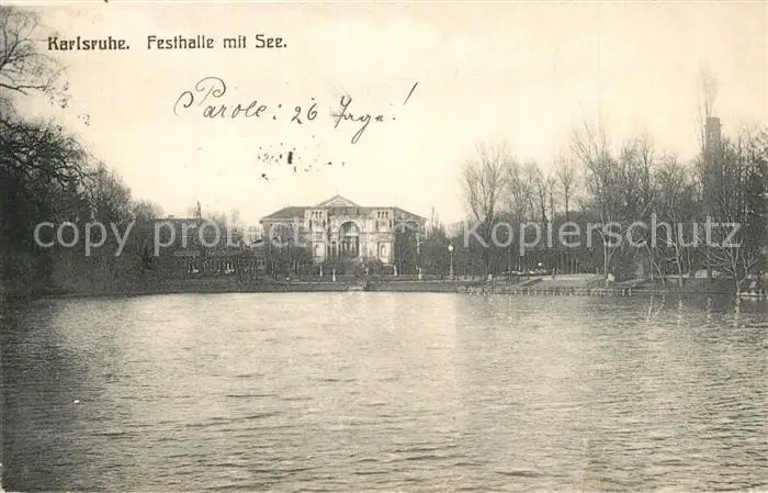 AK / Ansichtskarte Karlsruhe_Baden Festhalle mit See Karlsruhe_Baden