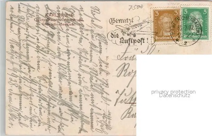 Karlsruhe_Baden Grenadierdenkmal Oberpostamt Kaiserstrasse Karlsruhe_Baden postalisch gelaufen 1922 Erhaltung siehe scans [KathaD81] Kathoren