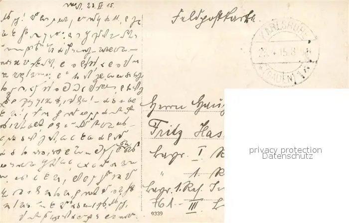 Karlsruhe_Baden Wohnhaus Innenstadt Karlsruhe_Baden postalisch gelaufen 1915 Feldpost Erhaltung siehe scans [FriedD77] Feldpost Frierer